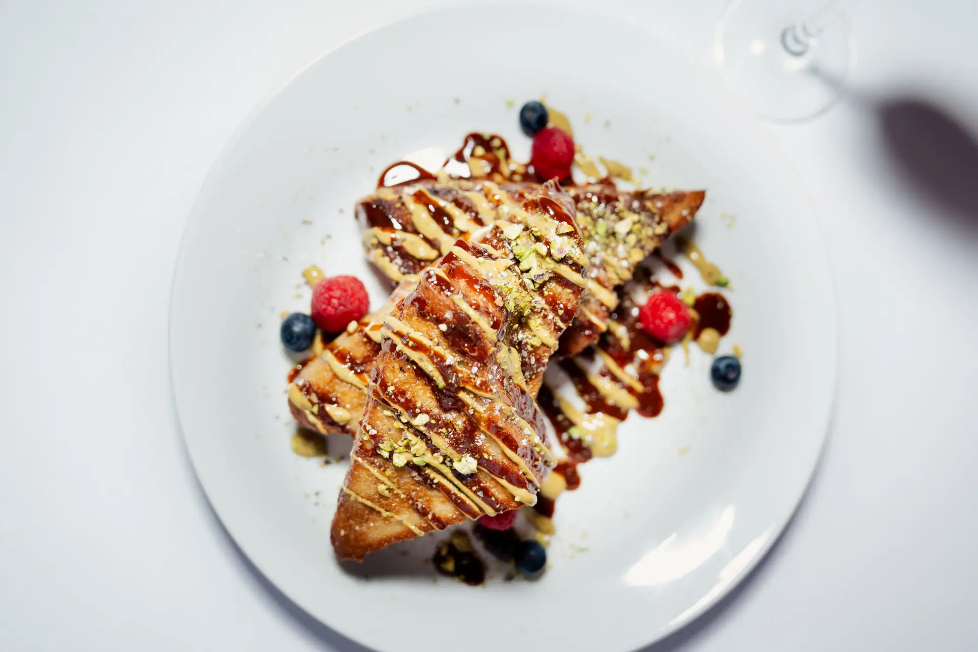 Pain doré sauce choco-caramel, crème de pistache